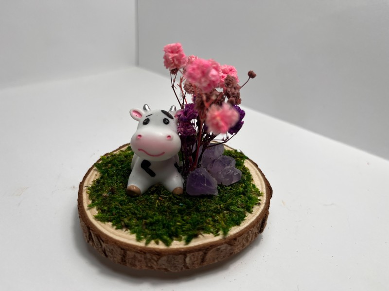 Sitting Cow - Natural Amethyst Stones, Pink, Violet, Purple Flowers with Green Grass.