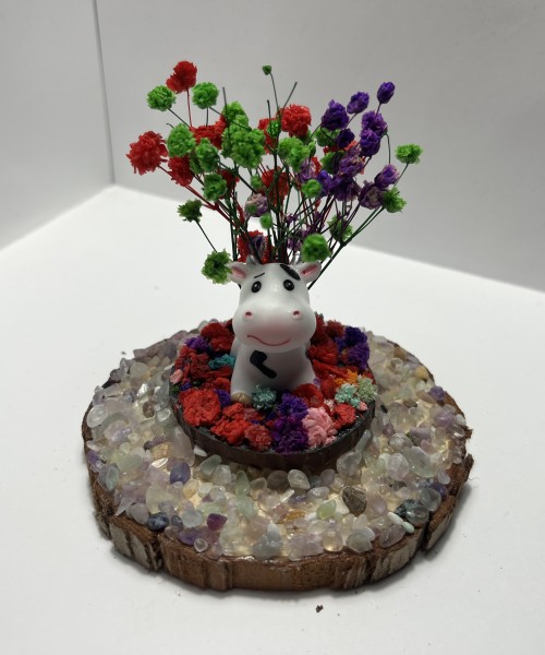 Sitting Cow Under A Tree of Red, Green & Purple Flowers. Vibrant Fluorite Stones.
