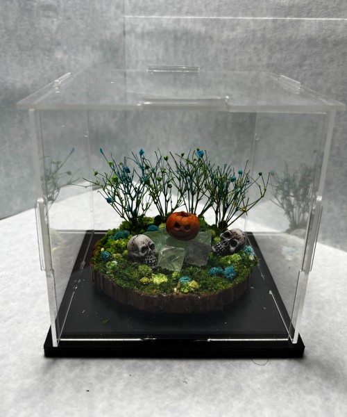 Pumpkin & Skulls - Fluorite Crystals, Green and Teal Flowers and Trees, Green Grass. Display Case