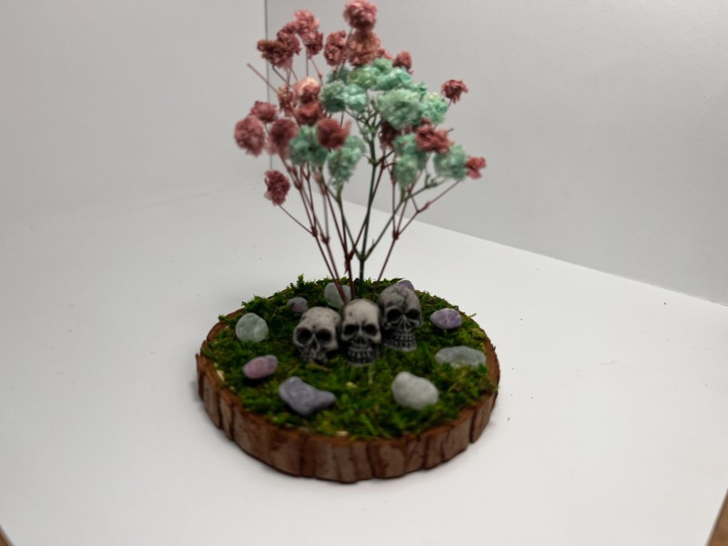 Three Skulls Resting Under a Violet & Aqua Flowered Tree, Surrounded By Grass & Fluorite Stones