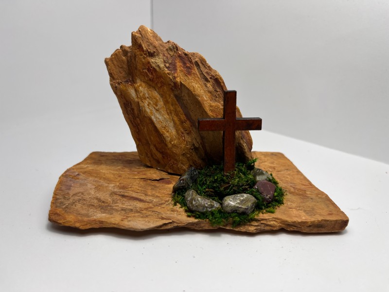 A cross on a mound of grass, surrounded by Natural Dragon Blood Stone Quartz, mounted on rocks.