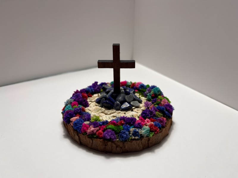A Cross With A Base Of Lapis Lazuli Natural Stones, Surrounded By A Boutique Of Colorful Flowers.